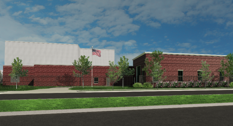 Image Above: Rendering the White Lodge Water Treatment Plant. The building features a brick facade that matches the existing building, a flagpole with an American flag, fencing, trees, and shrub plantings.